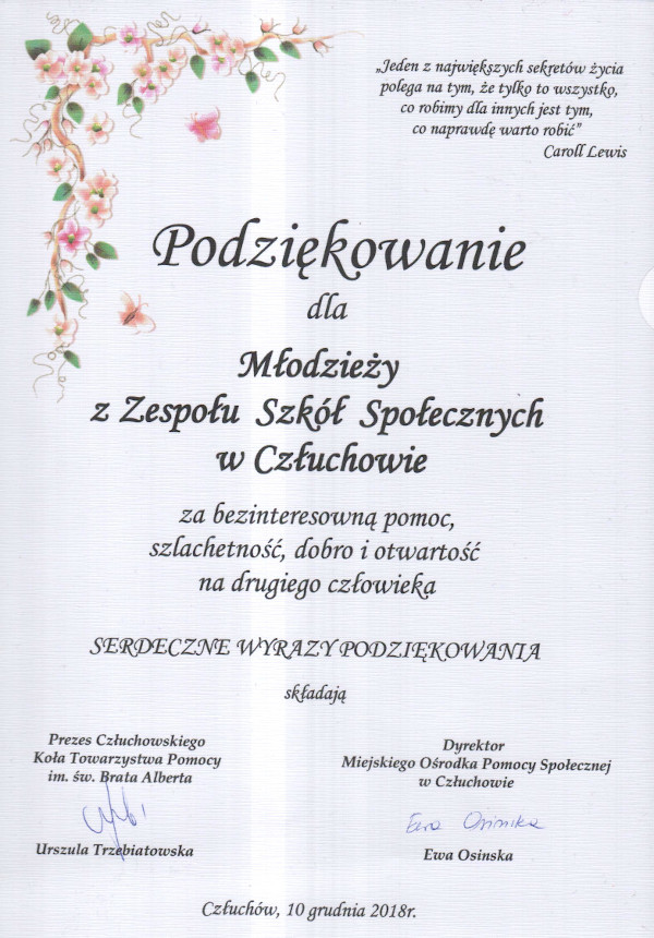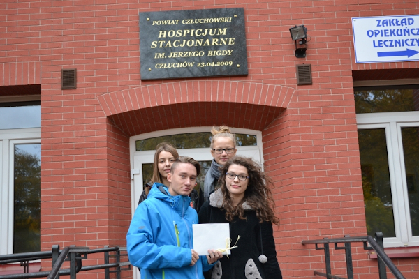 Od wielu lat nasi uczniowie i pracownicy pomagają człuchowskiemu Hospicjum im. Jerzego Bigdy. Uczniowie spędzają czas na wolontariacie pomagając w pracach w hospicjum, organizują kawiarenki, z których dochód trafia na konto jednostki. W szkole organizowane są zbiórki pościeli, ręczników itp.
