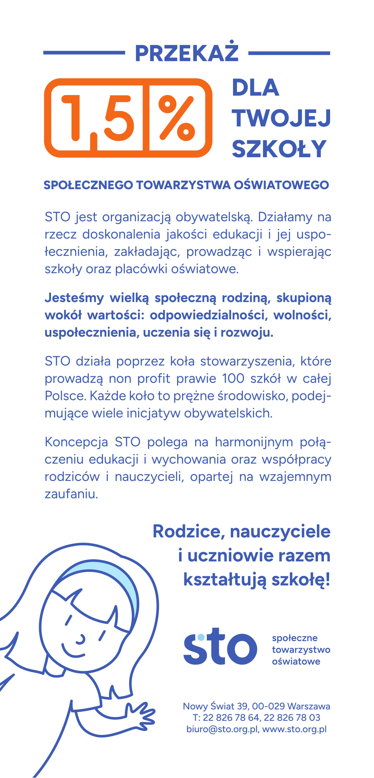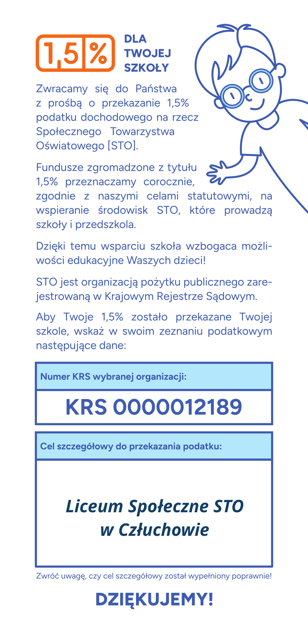 Zwracamy się z prośbą do Rodziców i Przyjaciół szkoły o przekazanie na rzecz Społeczniaka 1,5 % podatku dochodowego.